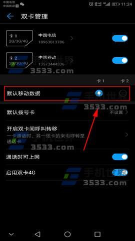 2)随后我们在点击进入【双卡管理】功能,最后点击默认移动数据旁边的按钮就选择要设置的上网SIM卡即可。(如下图)