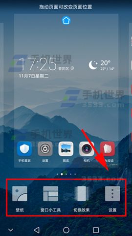 1)打开手机张开两指按住主屏幕然后【向内捏合】,接着就会进入主屏幕编辑模式,再点击右下角的【设置】。(如下图)