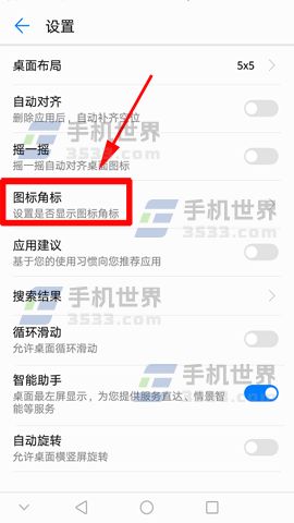 2)接着点击【图标角标】选项,这时就能看到每个应用的右边都有个开关,把要隐藏的应用开关关闭就不会再显示应用角标提醒了。(如下图)