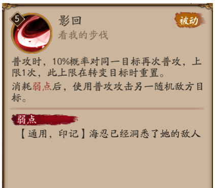 (唯一效果)每次攻击时,为目标附加1层“弱点”,上限3层。若目标带有3层“弱点”,则消耗所有层数,并改为对敌方全体造成攻击120%伤害,此次攻击不触发敌方御魂及被动。