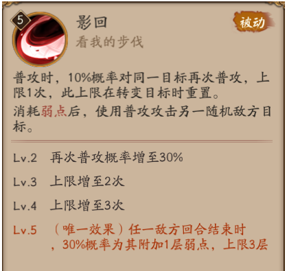 升至满技能之后,不仅普攻次数上限增至3次,甚至又新增一个唯一效果:任一敌方回合结束时,30%概率为其附加1层“弱点”,上限3层。