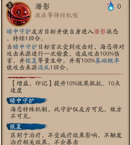 当“暗中守护”目标首次受到攻击时,海忍将对攻击来源进行一次偷袭,造成攻击100%伤害,并恢复等量生命,并有100%基础概率使攻击来源混乱1回合。