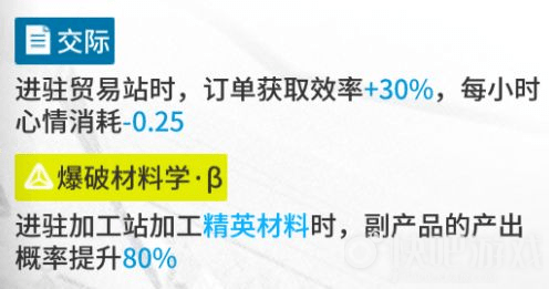 【爆破工程学 · β】:在加工精英材料时可以用到的技能。因为拥有同类技能的干员很多,而1%到2%的差别实在不大,笔者并不推荐博士让空爆进驻加工站。