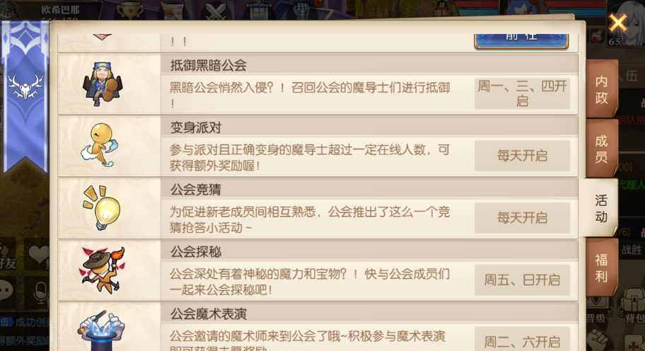 公会里的活动很多,其中每周刷新的公会委托任务是必做的,不仅简单而且能获得大量的经验、帮贡以及帮派资金,在成员列表中会显示贡献度,方面公会中的管理者判断该公会成员有没有做贡献。除此之外,还有变身派对、公会竞猜、公会魔术表演、公会探秘等等限时活动玩法也能获得不错的奖励。其中抵御黑暗公会和大魔斗演武最为重要,前者能提供大量的公会维护资金,而后者与其他公会的对抗,有可能获得诸如高级装备雕文、高级技能书等等极品道具。