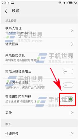 2)接着点击【设置】,进入设置界面后把【智能识别陌生号码】选项开启,这样系统就会自动识别陌生号码并且会显示在来电界面。(如下图)