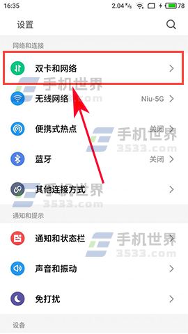 1)打开手机的【设置】,进入设置菜单后再点击打开【双卡和网络】选项。(如下图)