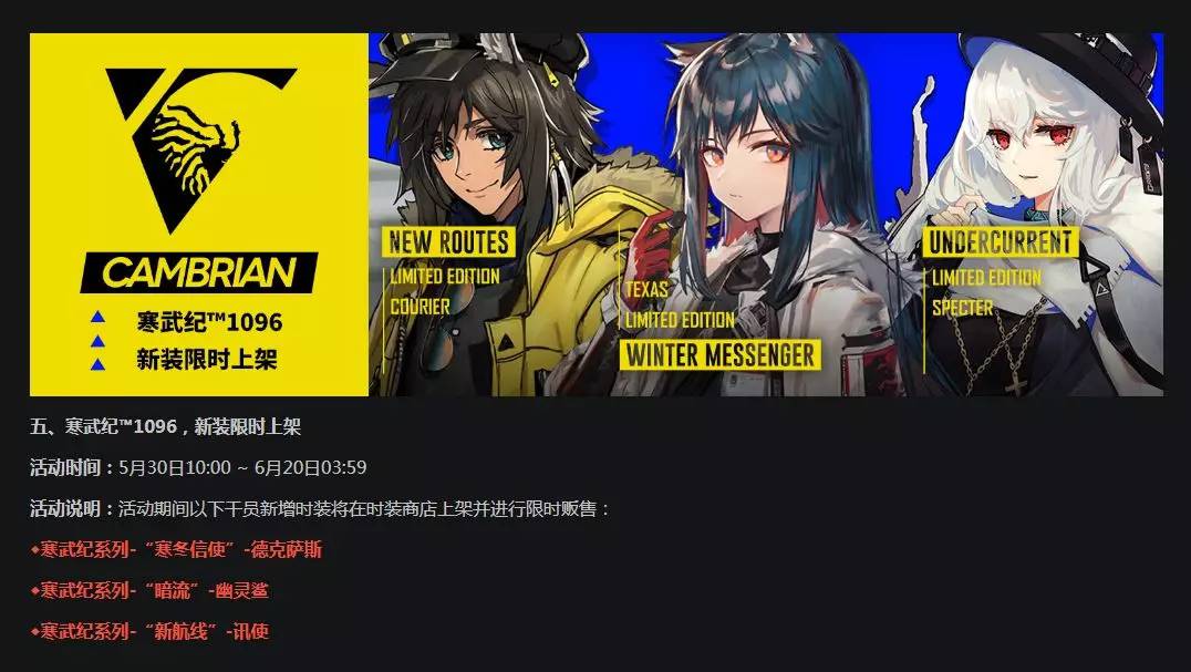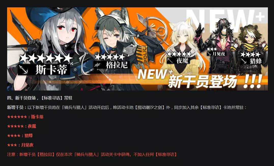 除去格拉尼以外的四个新增干员将在「骑兵与猎人」活动开启后,同步加入其余【标准寻访】卡池并常驻(也就是你在以后的标准池子里也可以抽出他们)。