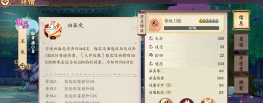 【符灵天赋】:玉兔这个符灵,本身的天赋资质就很一般,但是胜在较为均衡的设定,不像是有些强力妖灵只有一项技能是甲等,另外全部是丙等。玉兔的防御不强,作为攻击类型的符灵,全乙的生命、攻击、速度赋予了这个符灵无与伦比的作战方向,快功速度战术或者高攻暴击流派,都是玉兔可以发挥的作用。