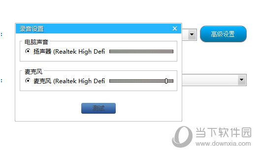 4、出现录音设置的界面后,将会出现录制声音时电脑声音与麦克风在录制时的音量,你也可以点击“测试”选项测试每个声音的音量大小,,这样在接下里的录制过程中就不会出现没有声音的情况,如下图所示: