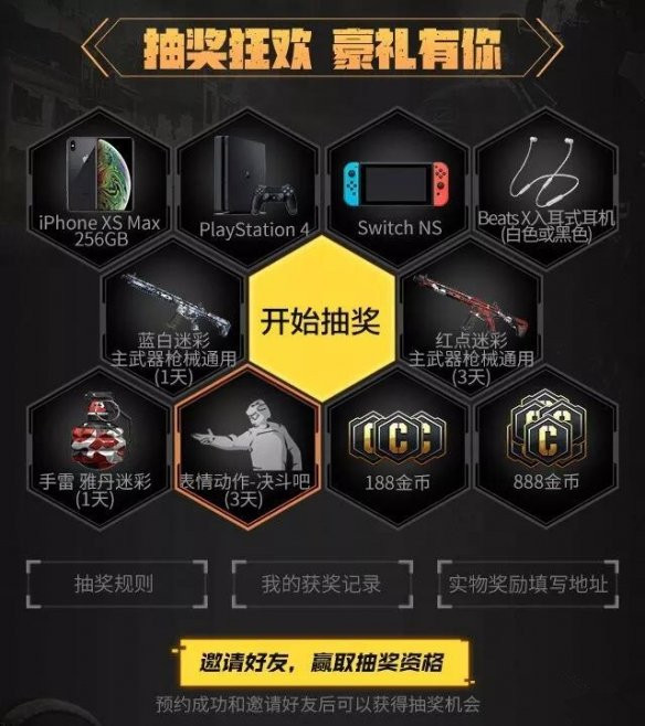 邀请好友共赴全新战场,在好友成功预约后即可赢取一次抽奖资格,就有机会抽中iPhoneXS、PS4、Switch NS等主机大奖;当然还有各类游戏武器迷彩涂装、游戏金币、特殊表情动作等奖励待你收获囊中!