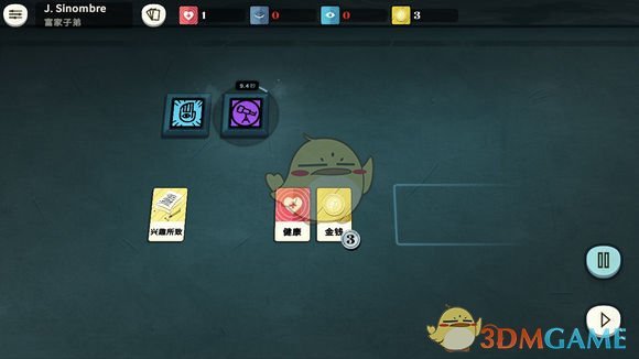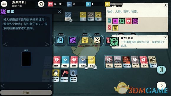富二代的话,开局会先给工作和调查,其中调查暂不可用,只有工作能放卡牌。通过上述方式,可以发现兴趣所致和健康都可以放在工作里,将这两张卡拖进工作(蓝)里点开始,就能产钱了。
