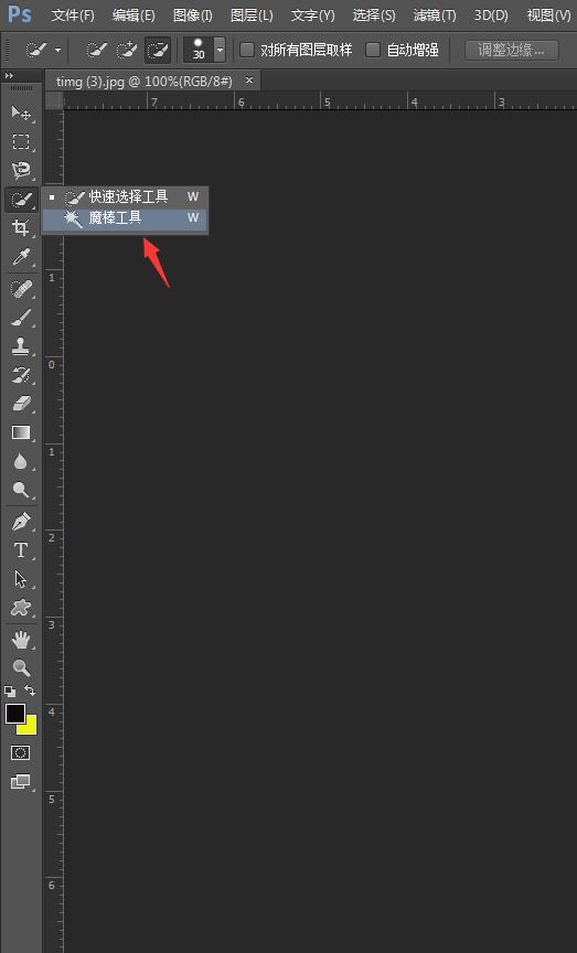 1、首先打开ps,再将图片打开,接着在左侧的工具栏中找到魔术棒工具