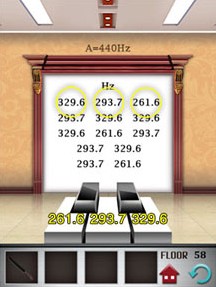 对于不熟悉乐律的我们还真有些难度。电梯门前有5个钢琴键,黑色的键在本关不起作用,白色的从左至右一次代表261.6、293.7、329.6。过关方式也比较简单,从第一行开始,依次弹按下对应的白色键即可。