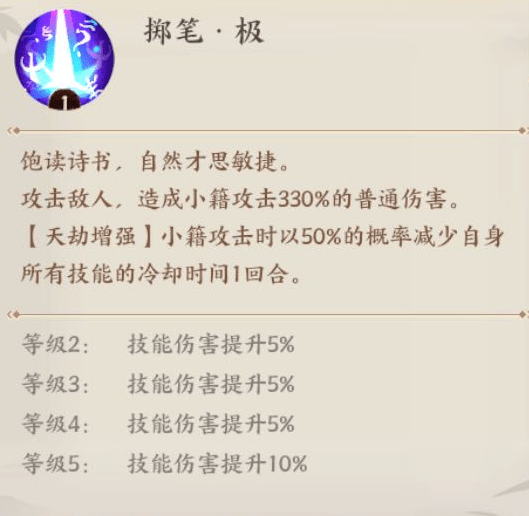 挥毫泼墨:攻击随机目标3次,分别造成小籍攻击170%的普通伤害,并分别使其受到持续2回合的虚弱效果,持续2回合的防御降低效果和持续2回合的禁疗效果。