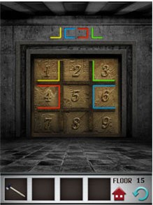 15关,门上面有4个图形,根据图形的提示,按照数字个字的划分,就能找出来密码了,再按照图形的顺序点击就能打开电梯门进入下一关。
