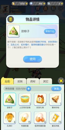 吃甜粽子有机会获得甜粽子铃铛,封妖灵珠*3,五色土*2,虹衫莓*1,强效恢复胶囊*2中的任意一个!(每日获取上限10个)