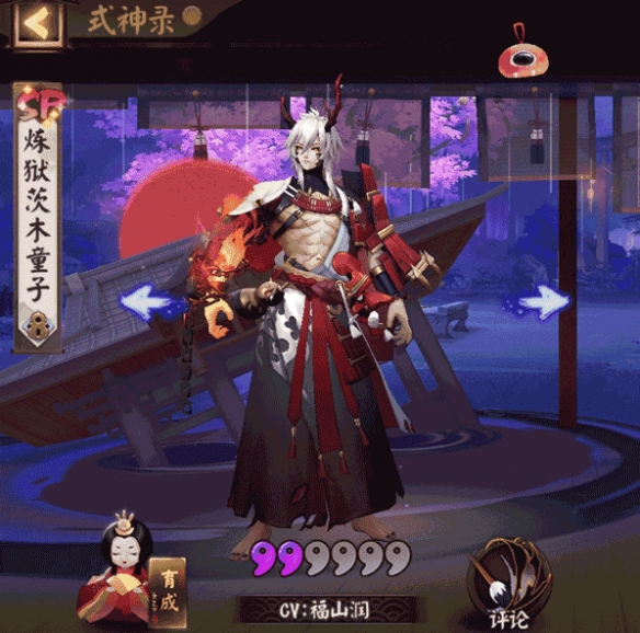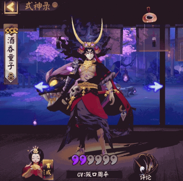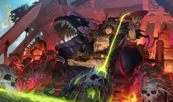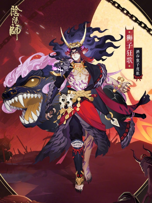 大江山退治前的酒吞童子,凛然而充满王者之气。身上的装饰元素以兽面、兽骨和兽纹为主。金色配饰点缀其中,风格华丽而张狂。铃铛作响,鬼王到来,百鬼皆为之胆颤。