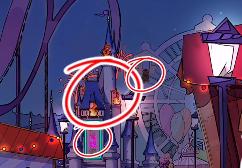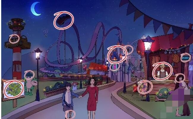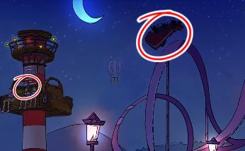 2、点击城堡招牌两次找到【鬼城招牌】和【城堡失火】、后面摩天轮上有个【玩偶熊】。