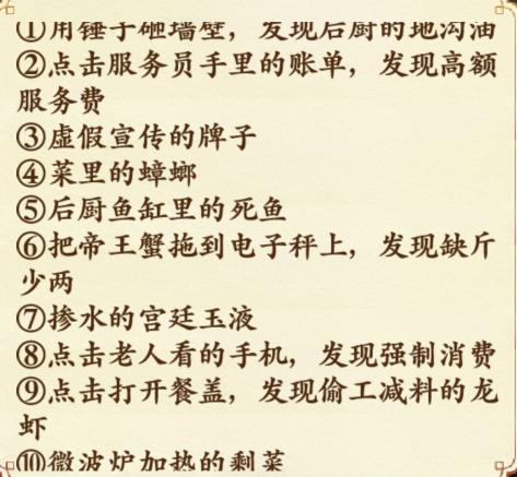 缺斤少两、虚假宣传、地沟油、死鱼、剩菜加热、高价服务费、强制消费、偷工减料、掺水饮料、蟑螂