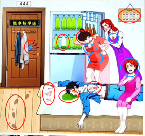 爆梗找茬王是一款好玩的解谜游戏,玩家可以挑战不同的关卡,挖掘自己的脑力极限,不知道怎么过也不要紧,小编带来了桑拿房疑案这一关的攻略分享!爆梗找茬王桑拿房疑案攻略通关条件:找出全部可疑点1、死者身上有一个红手印,还吐了好多液体,写了遗言。2、技师特别紧张,红衣服的女人拿着房产证,还怀孕了,一直在哭。3、紫色衣服的穿着裙子,但是有胸毛,冰箱里有很多酒。4、墙上的行程表全是按摩,地上一排脚印。5、拿出衣