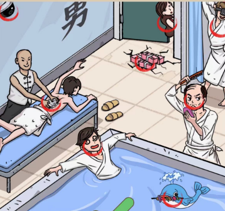爆梗找茬王是一款令人上瘾的解谜游戏,玩家需要解决各种复杂的难题,以达到游戏的目标。下面小编带来的是男澡堂的过关方法!爆梗找茬王男澡堂攻略通关条件:找出10处不合理的地方 1、左上角有监控,搓澡是用钢丝球,门缝有个女子。2、男的在池子里泡晕了,有个男的一边洗澡一边玩VR。3、把地上的水桶倒在照镜子的男的身上,变成地中海。4、地上有裂缝,点击两次就能看到很多钱。5、男的戴着VR眼镜洗澡,边上的男的拿着
