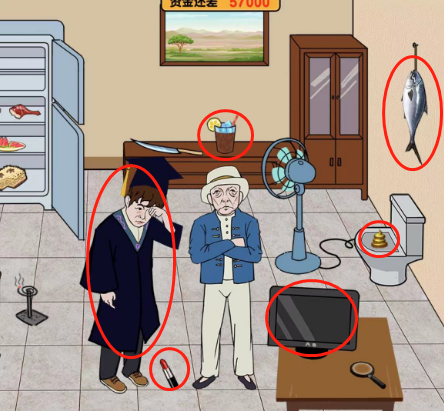 爆梗找茬王是一款令人上瘾的解谜游戏,玩家需要解决各种复杂的难题,以达到游戏的目标。下面小编带来的是你是大聪明创业资金的过关方法!爆梗找茬王创业资金攻略通关条件:变卖家产。1、把咸鱼放到冰箱里,变成冻鱼,马桶搋子移动到马桶里获得黄金大便。2、点击显示器和口红,墙上挂着的学士帽戴在强哥头上就变成打工仔。 3、把冰箱里的柠檬和冰块放到杯子里,倒入可乐,变成柠乐。4、用刀子切西瓜,把蚊香拖到西瓜上变成果盘