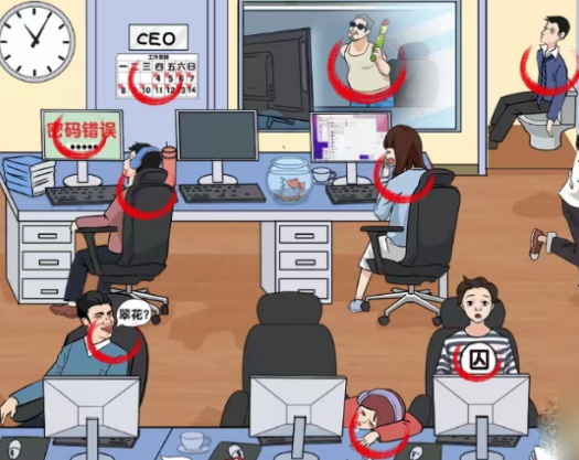 爆梗找茬王是一款令人上瘾的解谜游戏,玩家需要解决各种复杂的难题,以达到游戏的目标。下面小编带来的是你是大聪明节后上班的过关方法!爆梗找茬王节后上班攻略通关条件:找出12处节后上班的特征。1、玻璃里的老板还在嗨,厕所里的同事肠胃不顺。2、墙上的工作时间表,右边的女生在打哈欠想睡觉。3、边上的男的密码都想不起来,看着钟计时下班。4、右边的男生上班如上刑,中间的女生根本睡不醒。5、左边的男生还在逃避现实