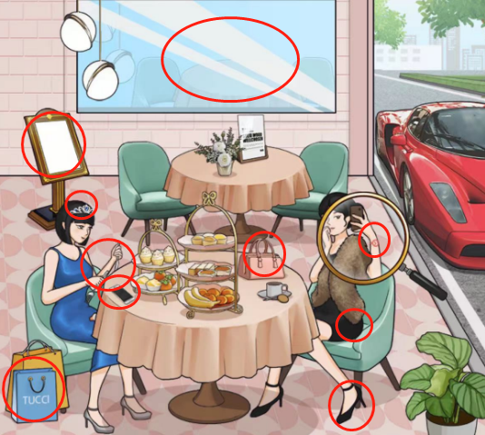 爆梗找茬王是一款令人上瘾的解谜游戏,玩家需要解决各种复杂的难题,以达到游戏的目标。下面小编带来的是你是大聪明上流名媛的过关方法!爆梗找茬王上流名媛攻略通关条件:找出装名媛的证据。1、玻璃上其实是快餐店的菜单,告示牌上写的是只能拍不要吃。2、左边女生带的是铁质头饰,她刀叉都拿反了,外套的吊牌都没摘。3、点击她的手机,里面有拼单群,名牌袋子里装的是早餐。4、右边女生的包都掉色了,表是用圆珠笔画的,袜子