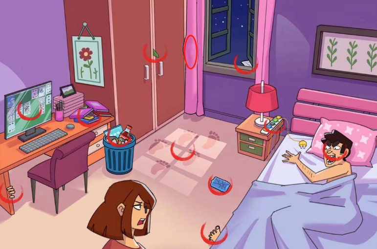 爆梗找茬王也是一款好玩的解谜游戏,玩家可以挑战不同的关卡,挖掘自己的脑力极限,不知道怎么过也不要紧,小编带来了卧室悬疑这一关的攻略分享!爆梗找茬王卧室悬疑攻略通关条件:找出12处老公不听话的证据。1、男人慌张的神色,地上摔碎的手机,还有地上的脚印。2、床头有很多插头,电脑上还有游戏,垃圾桶都是满的。3、桌子底下有一只手,床底下有只脚。4、衣柜缝里还有衣角,窗户边上还有衣角。5、窗帘上有个鬼影。 好