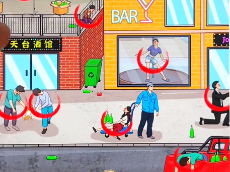 爆梗找茬王也是一款好玩的解谜游戏,玩家可以挑战不同的关卡,挖掘自己的脑力极限,不知道怎么过也不要紧,小编带来了酒后乱象这一关的攻略分享!爆梗找茬王酒后乱像攻略通关条件:找出12个喝醉的人。 1、一个人站在商店橱窗里,一个人穿着西装要和消防栓求婚,车上还趴着一个人。2、一个女生坐在推车上被管理人员拉着,两个人拉着狗跳舞。 3、一个男的在跳钢管舞,还有一个男的被栏杆夹头,打开那个垃圾桶,里面还有一个人