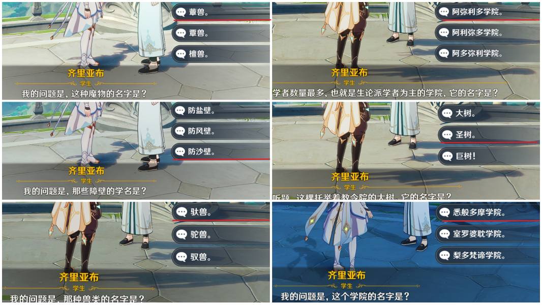 随着原神3.0版本的更新以及须弥的地图上线解锁,很多新的玩法也都出现在了玩家身边,对此,游戏爱好者小编特意为大家准备了这边详细的内容攻略,让我们一起来看看吧!原神须弥博学者成就攻略【须弥博学者】相关委托:教令院,小问题完成方法:答对齐里亚布提出的6个问题(各答对一次)(1)魔物的名字蕈兽(2)兽类的名字驮兽(3)屏障的学名防沙壁(4)托举着教令院的大树圣树(5)生论派学者为主的学院阿弥利多学院(6