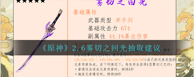 原神在2.6下半返场了雾切之回光。很多小伙伴都很想知道雾切之回光值不值得抽,对此,不了解的小伙伴,那就快来看看小编给大家准备的相关游戏内容吧!《原神》2.6雾切之回光抽取建议属性解读雾切的90级基础攻击力为674,是目前五星单手剑里唯二的基础攻击力最高的武器(另一把是风鹰剑)。策划基于武器的平衡性考虑,同星级的武器,基础攻击力高的副属性值就相应设置得低些,雾切副属性的爆伤才44.1%,和绿剑是相反