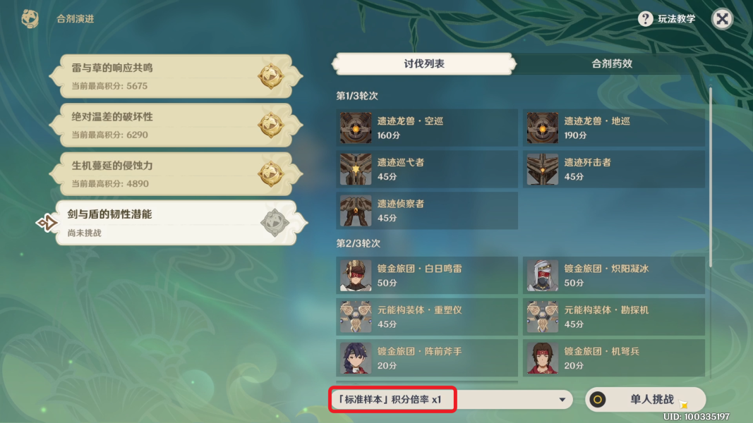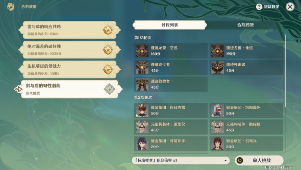 原神合剂演进第四次更新,很多小伙伴想要拿到所有的奖励,很多小伙伴不知道怎么获得,用什么阵容好,接下来就跟游戏爱好者小编一起来看看吧,有需要的小伙伴不要错过!原神合剂演进第四次怎么拿满奖励 剑与盾的韧性潜能选择「标准样本」 积分倍率x1试用角色输出循环介绍*若积分不够,可重置单轮,重复挑战第一轮-输出循环介绍(3800分左右)配队:宵宫、神里绫人输出循环:技能时间到就换人①神里绫人EA、E结束后Q换