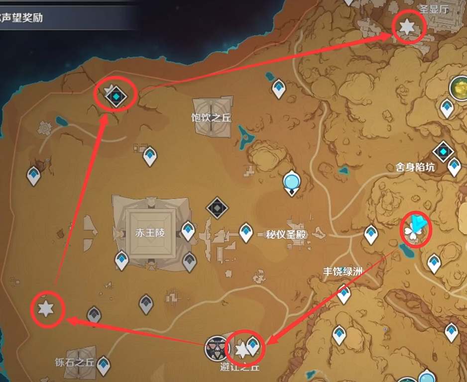 原神手游中随着新版本的地图上线,很多宝箱以及解谜机关也正式开启了,那么其中幻影壁画隐藏宝箱应该怎么获得?不要着急,接下来小编就给大家带来这方面的详细内容,感兴趣的小伙伴们可千万不要错过了哦。原神幻影壁画宝箱解密攻略1、首先在沙漠地图中一些特殊点位会有壁画,白天靠近的话没有互动,但是将时间调到晚上的话就可以触碰壁画。壁画所在的具体位置如下图所示,一共有5个点位,大家可以参考下图所示的路线来进行收集。