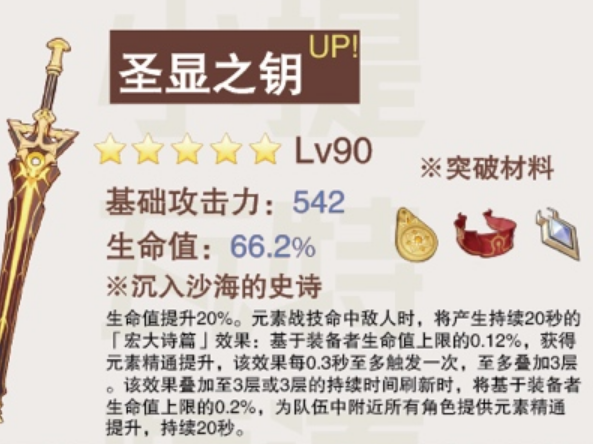 原神手游在3.1版本的更新中上线了很多的新武器,而圣显之钥作为其中之一,很多小伙伴对于它的属性都非常好奇,对此,游戏爱好者小编特意为大家准备了这边详细的内容攻略,让我们一起来看看吧!原神圣显之钥属性效果介绍圣显之钥基础攻击力:542生命值:66.2%※沉入沙海的史诗生命值提升20%。元素战技命中敌人时,将产生持续20秒的「宏大诗篇」效果:基于装备者生命值上限的0.12%,获得元素精通提升,该效果每