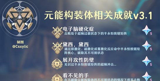 原神手游中元能构装体作为这次版本更新的怪物之一,玩家能够通过击败它来获得物种成就解锁,相信还有很多小伙伴不清楚,对此游戏爱好者小编特地为大家准备了相关的详细内容,让我们一起来看看吧!元能构装体成就攻略详解1.电子脑硬化症在矩阵瘫痪时间击败即可。这个成就比较难,输出时间短。首先需要带雷元素角色。矩阵施放完第一招后即进入隐蔽模式,期间游离出4个部件,摧毁任意一个部件就可以让其进入修复部件的状态,此时使