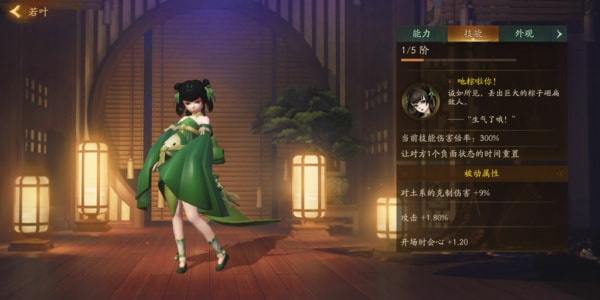 神都夜行录若叶是一个木属性的SR妖灵,是个偏向辅助的妖灵,套路需要小伙伴开发了,那么神都夜行录若叶怎么样呢,接下来小编给大家带来若叶技能属性详解。 神都夜行录若叶怎么样 若叶(五行:木) 稀有度:SR 满级属性:70级 攻击:3868 降妖师攻击加成:266 气血:20880 降妖师气血加成:1890 战斗技能 当前技能伤害倍率300%,让对方一个负面状态的时间重置;