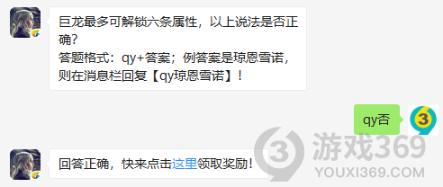 巨龙最多可解锁六条属性,这说法是否正确?答题格式:qy+答案,12月2日权力的游戏凛冬将至每日一题的答案是什么?不知道的领主们,进来看看正确答案吧!回答正确即可领取小蓝为大家准备的丰厚奖励了权力的游戏凛冬将至12月2日问题:巨龙最多可解锁六条属性,这说法是否正
