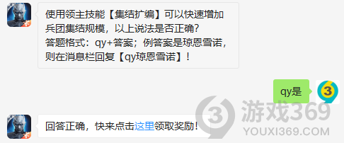 使用领主技能集结扩编可以快速增加兵团集结规模,这说法是否正确?答题格式:qy+答案,12月5日权力的游戏凛冬将至每日一题的答案是什么?不知道的领主们,进来看看正确答案吧!回答正确即可领取小蓝为大家准备的丰厚奖励了权力的游戏凛冬将至12月5日问题:使用领主技能集