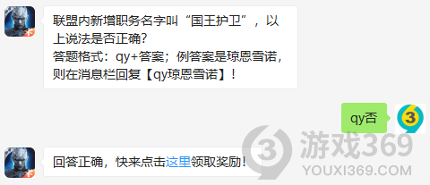 联盟内新增职务名字叫国王护卫,这说法是否正确?答题格式:qy+答案,12月7日权力的游戏凛冬将至每日一题的答案是什么?不知道的领主们,进来看看正确答案吧!回答正确即可领取小蓝为大家准备的丰厚奖励了权力的游戏凛冬将至12月7日问题:联盟内新增职务名字叫国王护卫,