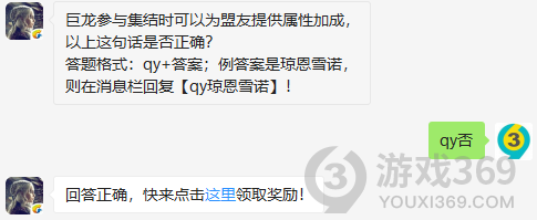 巨龙参与集结时可以为盟友提供属性加成,这这句话是否正确?答题格式:qy+答案,11月27日权力的游戏凛冬将至每日一题的答案是什么?不知道的领主们,进来看看正确答案吧!回答正确即可领取小蓝为大家准备的丰厚奖励了权力的游戏凛冬将至11月27日问题:巨龙参与集结时可