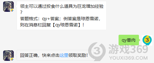 领主可以通过投食什么道具为巨龙增加经验?答题格式:qy+答案,11月30日权力的游戏凛冬将至每日一题的答案是什么?不知道的领主们,进来看看正确答案吧!回答正确即可领取小蓝为大家准备的丰厚奖励了权力的游戏凛冬将至11月30日问题:领主可以通过投食什么道具为巨龙增