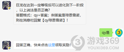 巨龙在达到一定等级后可以进化到下一阶段,这说法是否正确?答题格式:qy+答案,12月1日权力的游戏凛冬将至每日一题的答案是什么?不知道的领主们,进来看看正确答案吧!回答正确即可领取小蓝为大家准备的丰厚奖励了权力的游戏凛冬将至12月1日问题:巨龙在达到一定等级后
