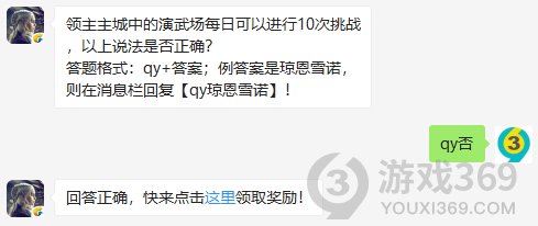 领主主城中的演武场每日可以进行10次挑战,这说法是否正确?答题格式:qy+答案,11月20日权力的游戏凛冬将至每日一题的答案是什么?不知道的领主们,进来看看正确答案吧!回答正确即可领取小蓝为大家准备的丰厚奖励了权力的游戏凛冬将至11月20日问题:领主主城中的演