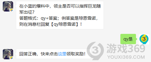 在小蓝的爆料中,领主是否可以指挥巨龙随军出征?答题格式:qy+答案,11月22日权力的游戏凛冬将至每日一题的答案是什么?不知道的领主们,进来看看正确答案吧!回答正确即可领取小蓝为大家准备的丰厚奖励了权力的游戏凛冬将至11月22日问题:在小蓝的爆料中,领主是否可