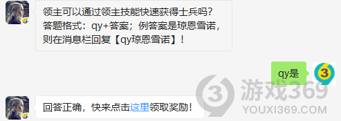 领主可以通过领主技能快速获得士兵吗?答题格式:qy+答案,11月15日权力的游戏凛冬将至每日一题的答案是什么?不知道的领主们,进来看看正确答案吧!回答正确即可领取小蓝为大家准备的丰厚奖励了权力的游戏凛冬将至11月15日问题:领主可以通过领主技能快速获得士兵吗?