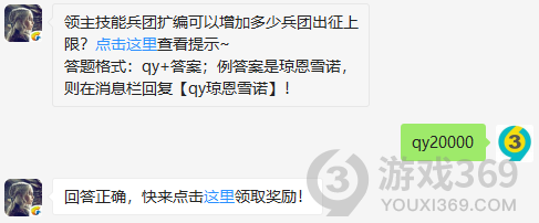 领主技能兵团扩编可以增加多少兵团出征上限?答题格式:qy+答案,11月17日权力的游戏凛冬将至每日一题的答案是什么?不知道的领主们,进来看看正确答案吧!回答正确即可领取小蓝为大家准备的丰厚奖励了权力的游戏凛冬将至11月17日问题:领主技能兵团扩编可以增加多少兵