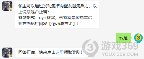 领主可以通过发动集结向盟友召集兵力,这说法是否正确?答题格式:qy+答案,11月19日权力的游戏凛冬将至每日一题的答案是什么?不知道的领主们,进来看看正确答案吧!回答正确即可领取小蓝为大家准备的丰厚奖励了权力的游戏凛冬将至11月19日问题:领主可以通过发动集结