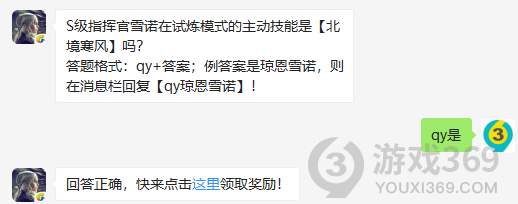 S级指挥官雪诺在试炼模式的主动技能是北境寒风吗?答题格式:qy+答案,10月23日权力的游戏凛冬将至每日一题的答案是什么?不知道的领主们,进来看看正确答案吧!回答正确即可领取小蓝为大家准备的丰厚奖励了权力的游戏凛冬将至10月23日问题:S级指挥官雪诺在试炼模式