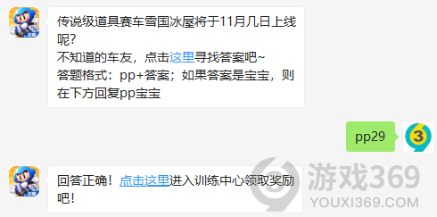 传说级道具赛车雪国冰屋将于11月几日上线呢?答题格式:pp+答案,11月29日跑跑卡丁车每日一题的答案是什么?不知道的车主宝宝们,进来看看正确答案吧!回答正确即可领取皮蛋为大家准备的丰厚奖励了跑跑卡丁车11月29日问题:传说级道具赛车雪国冰屋将于11月几日上线